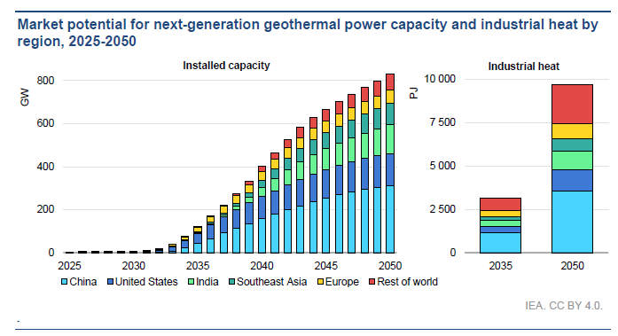 - China: With its significant reliance on coal and rapid clean energy transitions, China is targeting geothermal to meet nearly 650 GW of additional dispatchable power capacity needed by 2050.