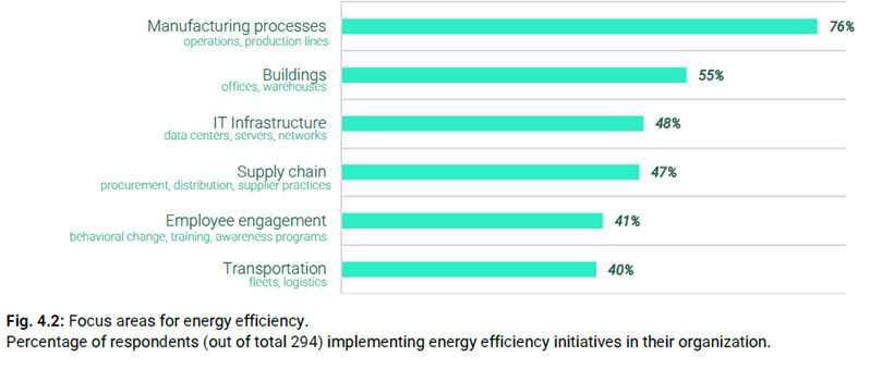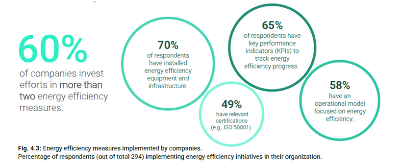 Manufacturing emerges as a primary area of focus, where efficiency initiatives are often most concentrated. In most organizations, energy efficiency infrastructure is already in place and supported by dedicated internal resources. 60% of the companies have invested in more than 2 energy efficiency measures indicating that a mix of technologies and solutions is the best choice addressing effective energy reduction targets of short, medium and long term period.