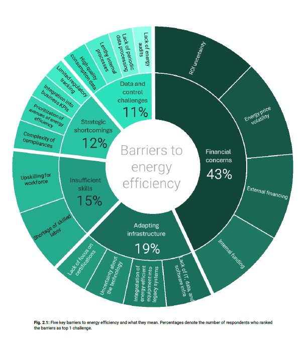 Financial concerns emerge as the most significant barrier to energy efficiency, with 43% of survey respondents identifying it as their top challenge. Despite growing awareness and increasing budgets, 84% of companies still believe that funding is insufficient to meet their efficiency goals.