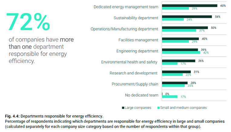 The majority have at least one department overseeing energy efficiency activities, and about half have a specialized energy management team. Interestingly, companies with such dedicated teams are significantly more likely to report consistent budget growth—suggesting that focused internal expertise contributes to stronger awareness of ROI and long-term benefits.