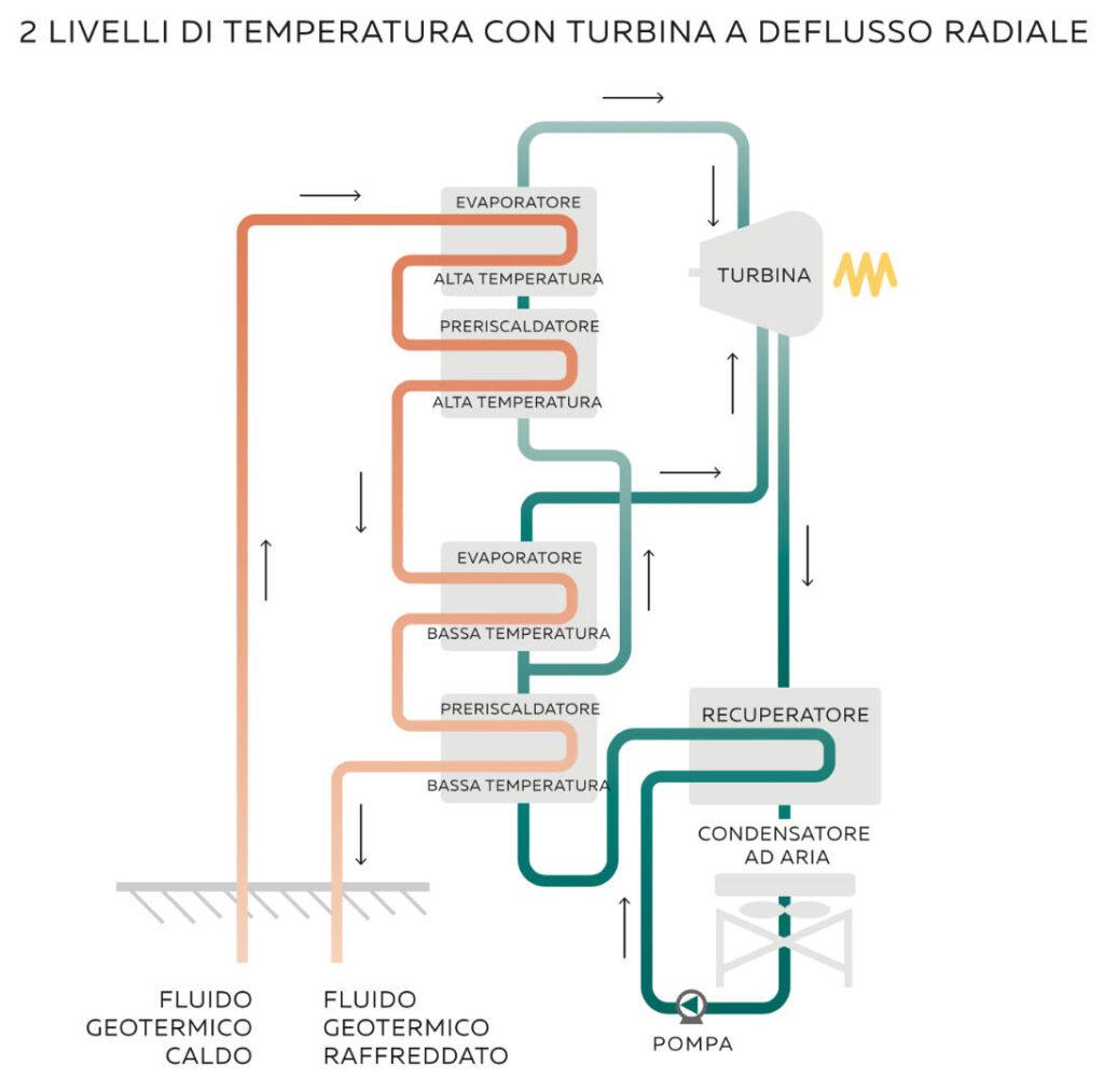 Il fluido geotermico passa attraverso la prima sequenza scambiatori di calore ad ALTA pressione e trasferisce il calore al fluido organico. Il fluido organico si trasforma in vapore ed entra nell’ingresso ad alta pressione della turbina. Successivamente il fluido geotermico passa attraverso la seconda sequenza di scambiatori di calore a BASSA pressione, trasforma il fluido organico in vapore che viene immesso nell’ingresso a bassa pressione della turbina. La Turbina Radiale Outflow (ROT), alimentata dal fluido organico ad ALTA e BASSA pressione, spinge il generatore a produrre energia elettrica. Il fluido geotermico viene alla fine re-immesso nel sottosuolo ed il ciclo ricomincia.