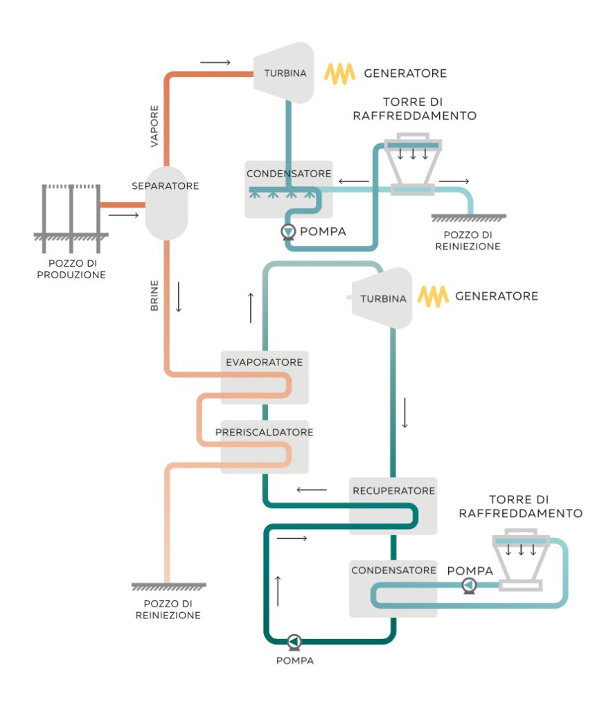 Negli impianti flash a vapore durante il funzionamento una parte della capacità termica viene dispersa nella fase liquida della risorsa (brine). Combinando un impianto ORC ad uno ciclo flash a vapore è possibile recuperare in modo efficiente ed efficace il calore disponibile nel brine geotermico per produrre energia elettrica aggiuntiva.
