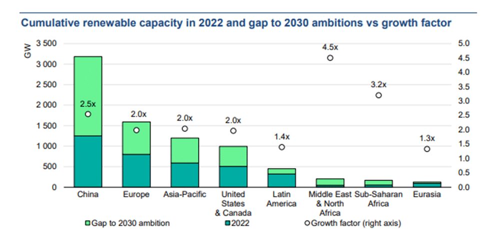 Oltre ai significativi contributi della Cina e dell’Europa, anche altre regioni giocano un ruolo cruciale nella transizione globale verso l’energia rinnovabile. La regione Asia Pacifica, guidata da India e Giappone, rappresenta il 15% delle ambizioni globali, con l’India che punta a 500 GW di capacità non fossile entro il 2030 e il Giappone che mira a una quota di energia elettrica rinnovabile del 36-38%. In Nord America, gli Stati Uniti e il Canada prevedono di raddoppiare la loro capacità rinnovabile a quasi 1.000 GW entro il 2030, contribuendo al 13% del totale globale. Mentre l’America Latina, con il Brasile in prima linea, prevede di aumentare la propria capacità rinnovabile di 1,4 volte rispetto al livello del 2022, sostenendo ulteriormente gli sforzi globali per ampliare l’energia rinnovabile entro la fine del decennio.