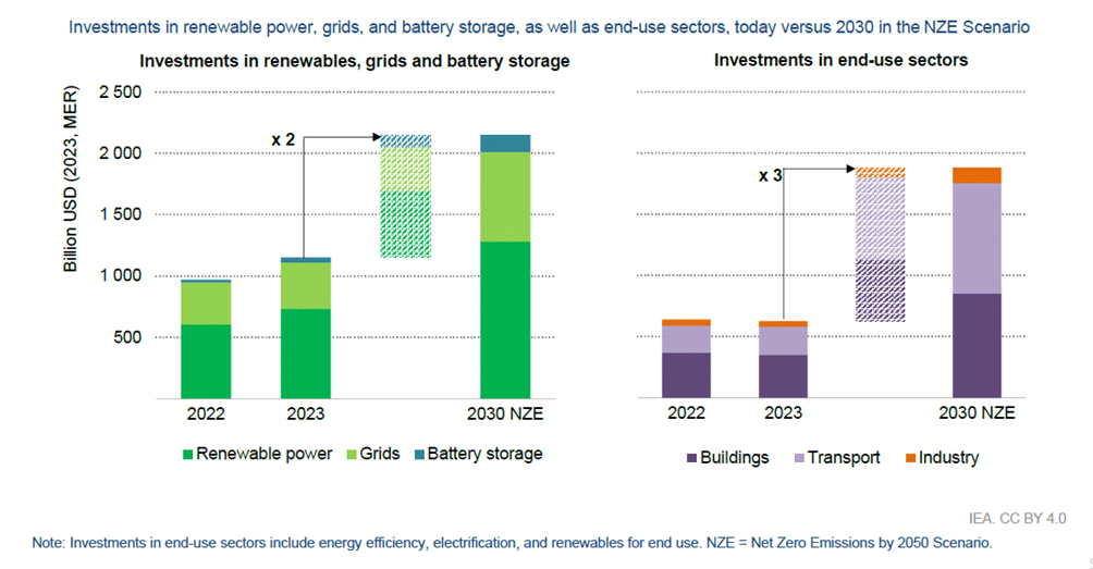 Mentre il mondo mira a limitare il riscaldamento globale a 1,5°C, le attuali tendenze di investimento in energia pulita e infrastrutture sono significativamente inferiori a quanto necessario per raggiungere questo obiettivo. Secondo lo IEA, è necessario un ulteriore investimento di 500 miliardi di USD all’anno per colmare il divario, in particolare per la generazione di energia rinnovabile, le reti e lo stoccaggio delle batterie. Questo aumento rappresenterebbe un raddoppio della spesa annuale attuale entro il 2030, con l’obiettivo di triplicare la capacità globale di energia rinnovabile.