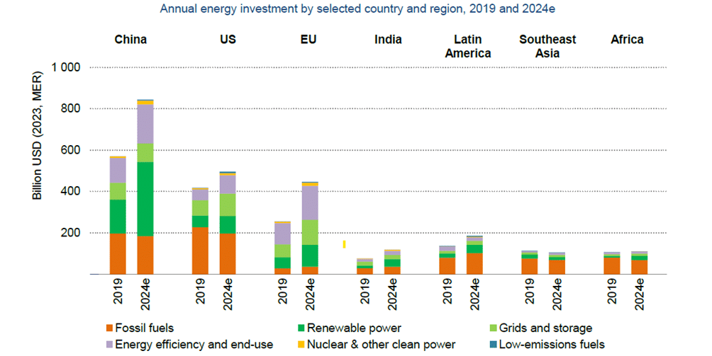 Per quanto riguarda le tendenze degli investimenti nazionali, si prevede che gli investimenti in energia pulita negli Stati Uniti supereranno i 300 miliardi di USD nel 2024, con un aumento di 1,6 volte rispetto ai livelli del 2020, superando significativamente gli investimenti nei combustibili fossili. L‘Unione Europea sta attualmente investendo circa 370 miliardi di USD in energia pulita, mentre si prevede che la Cina guiderà con quasi 680 miliardi di USD, grazie alla rapida crescita nella produzione di energia solare, batterie e veicoli elettrici.