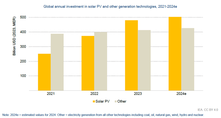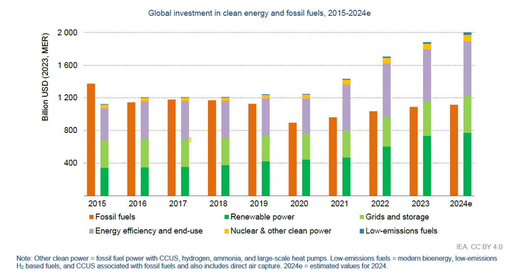 Nel 2024, si prevede che gli investimenti energetici globali supereranno i 3 trilioni di USD per la prima volta, con 2 trilioni di USD destinati a tecnologie e infrastrutture per l’energia pulita. Questo indica un cambiamento significativo, poiché gli investimenti in energia rinnovabile, reti e stoccaggio ora superano la spesa totale per i combustibili fossili tradizionali.