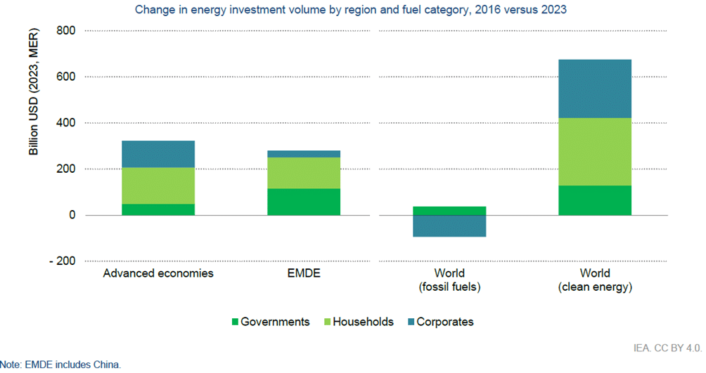 Le transizioni energetiche stanno rimodellando il modo in cui vengono prese le decisioni di investimento e chi le prende. Sebbene le aziende private dominino ancora gli investimenti energetici a livello globale, in particolare nelle economie avanzate, ci sono differenze notevoli tra le diverse regioni. Negli EMDE, metà di tutti gli investimenti energetici proviene da governi o imprese statali (SOE), rispetto al solo 15% nelle economie avanzate. Le compagnie petrolifere nazionali, soprattutto in Medio Oriente e Asia, hanno significativamente aumentato i loro investimenti negli ultimi anni, giocando un ruolo chiave nel finanziamento dei combustibili fossili e del settore energetico.