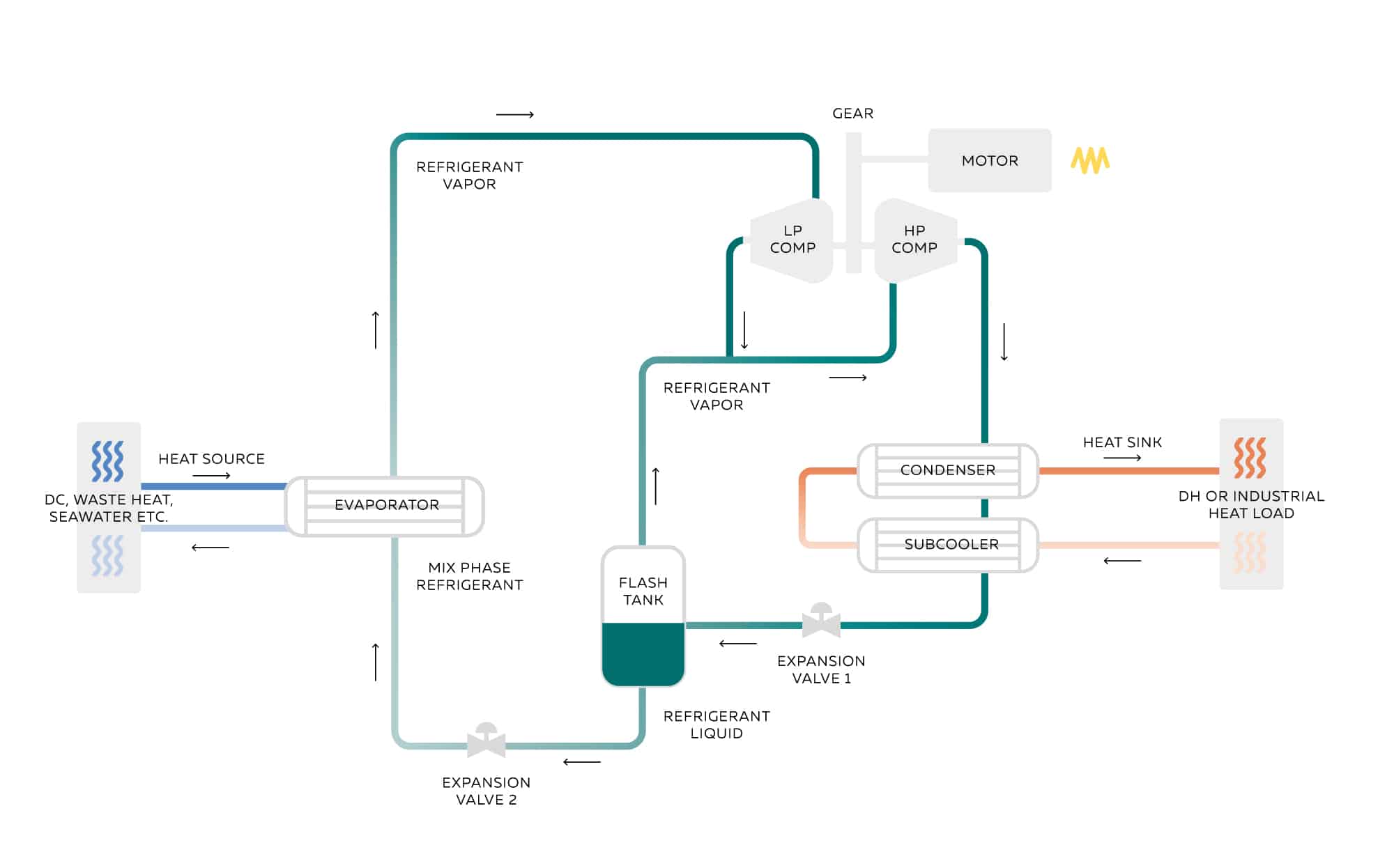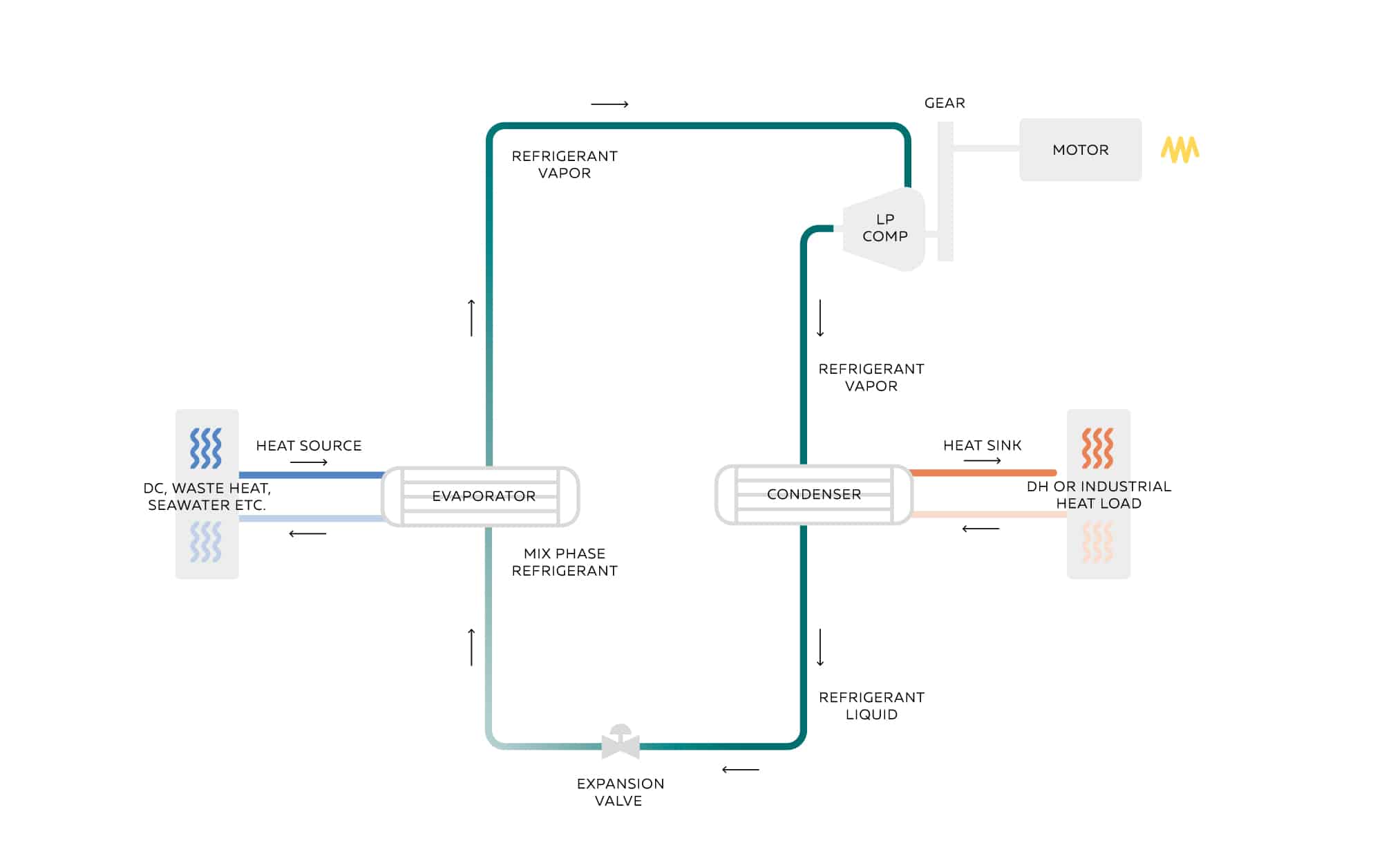 Industrial heat pumps are the ideal solution to the growing needs of decarbonizing heat generation in industrial processes and district heating networks. Instead of burning fossil fuels, industrial heat pumps use electricity to move thermal energy, delivering significantly more heat with the same amount of electricity compared to direct electrical heating. Industrial heat pumps contribute to lower operational costs and provide a sustainable and cost-effective energy supply.