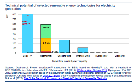 The technical potential based on these next generation geothermal systems is vast. EGS and CLGS overcome the dependency on natural reservoirs inherent in conventional geothermal projects, enabling the exploitation of geothermal heat in virtually any location. Concerning Electricity potential EGSs alone could provide nearly 300,000 exajoules (EJ) of thermal resources within 8 km of depth. This is equivalent to 600 TW of geothermal capacity operating for 20 years, nearly 2,000 times that of conventional geothermal systems. Thanks to these breakthrough innovations geothermal global technical potential for annual electricity generation could be estimated at 4,000 petawatt-hours (PWh), which is about 150 times current global electricity demand. The United States is seen as having the largest technical potential for enhanced geothermal capacity, accounting for roughly one-eighth of the global total. In terms of heat, geothermal extraction from sedimentary aquifers at depths of 0.5-5 km and temperatures over 90°C could provide over 250,000 EJ globally at a levelized cost of less than USD 50/MWh, equivalent to 320 TW sustained for 25 years. Even with less widely available geothermal heat above 200°C, the potential remains significant, estimated at 15,000 EJ, enough to meet nearly 500 years of global industrial heat demand for temperatures below 200°C. The United States holds the largest geothermal heat potential at 90°C, solidifying its position as a leader in the global geothermal sector.
