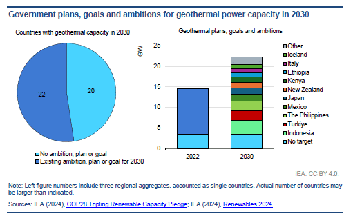 Despite gaining recognition on the global stage with 42 countries expected to have installed geothermal power capacity by 2030. Geothermal energy is currently included in the renewable energy goals of only 22 nations for the same year. Among those with the most ambitious targets are Indonesia, the Philippines, and Turkey, which are leading the way in geothermal power development. On the heating and cooling front, only a few countries have incorporated geothermal energy into their government plans and ambitions as a viable solution.