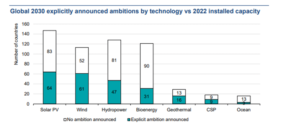 There are notable discrepancies between the technology-specific ambitions for renewable energy and the current installed capacities. Bioenergy is frequently overlooked despite its widespread use. While 124 countries have existing bioenergy capacity, only 31 have established clear goals for 2030. This gap partly arises because bioenergy is often integrated with non-renewable sources in national strategies, such as using solid biomass in co-firing processes and blending waste energy and biogases with hydrogen or other gases. This mismatch highlights the need for more explicit and focused ambitions for bioenergy in future energy plans.