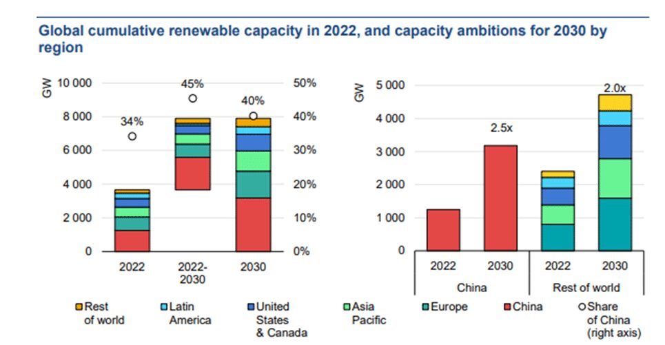 According to the IEA’s latest estimates, the collective ambitions of countries for 2030 aim to reach a total renewable energy capacity of 7,903 gigawatts (GW), which represents 2.2 times the installed capacity in 2022, serving as the baseline for the global tripling pledge. To achieve this ambitious target, countries will need to install nearly 4,250 GW of additional capacity by the end of the decade. China’s implicit ambition, driven by recent deployment trends, could see the country’s renewable capacity reach 2.5 times its 2022 level. This alone would account for 45% of the global capacity growth required to meet the overall target. If China successfully realizes this ambition, its share of global installed renewable capacity is expected to increase from 34% in 2022 to 40% by 2030, underscoring its critical role in the global energy transition.