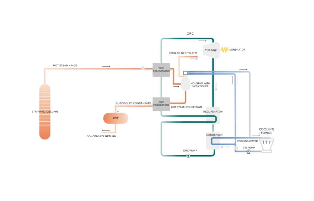 Organic Rankine cycle can be efficiently employed for waste heat recovery from distillation processes harvesting the available heat from the overhead process steam and non-condensable gases (NCG) flow from stripping columns in chemical plants. The ORC system here replaces the function of conventional column overhead condensers (fig. 1) with the key advantage of simultaneously generating electrical power. The flow of process steam and NCG is directed to the ORC heat exchangers (fi.2) transferring their heat to the organic working fluid of the ORC power cycle. The organic fluid vaporizes and is then conveyed to Exergy’s high efficiency ROT expander to produce electricity.