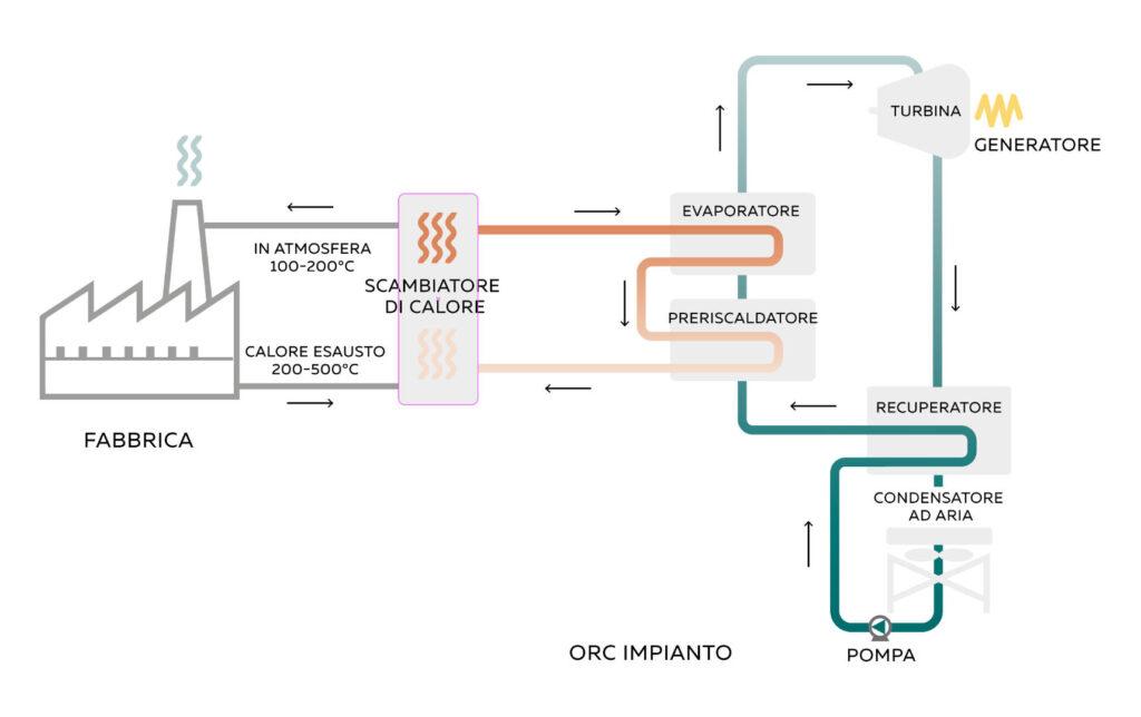 I cicli Rankine a fluido organico (ORC) sono una tecnologia ideale per il recupero di calore nei processi industriali. Al contrario dei sistemi di recupero di calore tradizionali che si basano su cicli Rankine a vapore, l’ORC può garantire migliori efficienze per applicazioni a temperature più basse (dai 90°C fino a 400 °C), ed al contempo non necessita di processi di trattamento e reintegro dell’acqua.