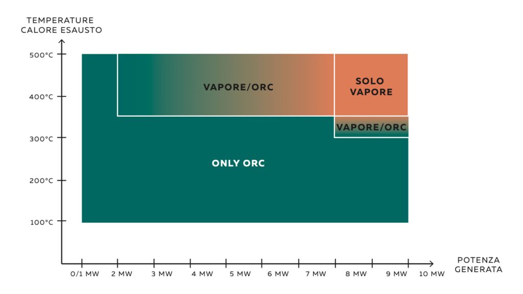 Indipendentemente dalla temperatura della fonte termica, l’ORC è generalmente la migliore soluzione per impianti di piccola taglia elettrica. La semplicità e la compattezza del sistema, la maggiore efficienza della turbina, l’ottima corrispondenza con la curva di rilascio del calore e le migliori prestazioni a carichi parziali, assicurano un’efficienza più elevata del sistema e un costo specifico più basso rispetto ad un ciclo Rankine a vapore. In alcuni casi poi la tecnologia ORC diventa l’unica soluzione praticabile, per esempio quando non vi è disponibilità di acqua.