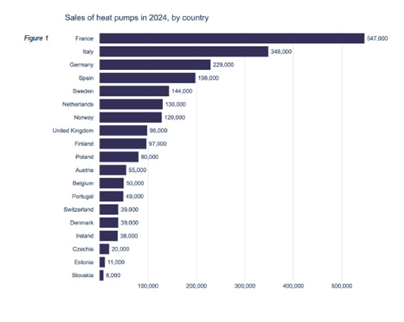 - La Francia ha subito un contraccolpo rilevante, soprattutto nel segmento aria-acqua, che ha perso 124.000 unità rispetto all’anno precedente. Sfide economiche e politiche, unite agli alti prezzi dell’elettricità, hanno pesato sul mercato. Tuttavia, con la riduzione dei costi dell’elettricità e l’entrata in vigore delle nuove normative edilizie (RE2020), il 2025 potrebbe segnare una ripresa.