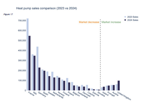 Alcuni mercati sono stati colpiti più duramente di altri: la Repubblica Ceca ha registrato un forte calo del 64%, seguita dalla Germania con un -48% nelle vendite. Al contrario, il Regno Unito ha sfidato la tendenza, mostrando un aumento del 56% delle vendite di pompe di calore.