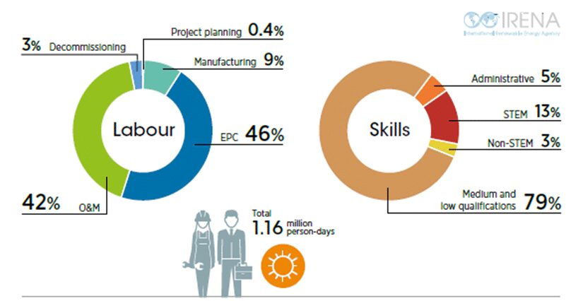 Il CSP presenta un forte potenziale di creazione di posti di lavoro in tutta la sua catena di valore, in particolare nei settori dell’ingegneria, dell’approvvigionamento, della costruzione (EPC), del funzionamento e della manutenzione (O&M) e dello smantellamento. Si stima che un impianto CSP con una capacità di 100 MW e un accumulo di energia termica di 10 ore richieda 1,16 milioni di giornate-uomo in tutta la catena del valore.