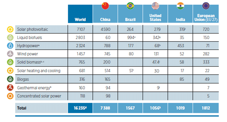 Il grafico seguente illustra la distribuzione dell’occupazione nel settore delle energie rinnovabili in alcuni paesi e regioni selezionati, mostrando i principali attori globali del settore.