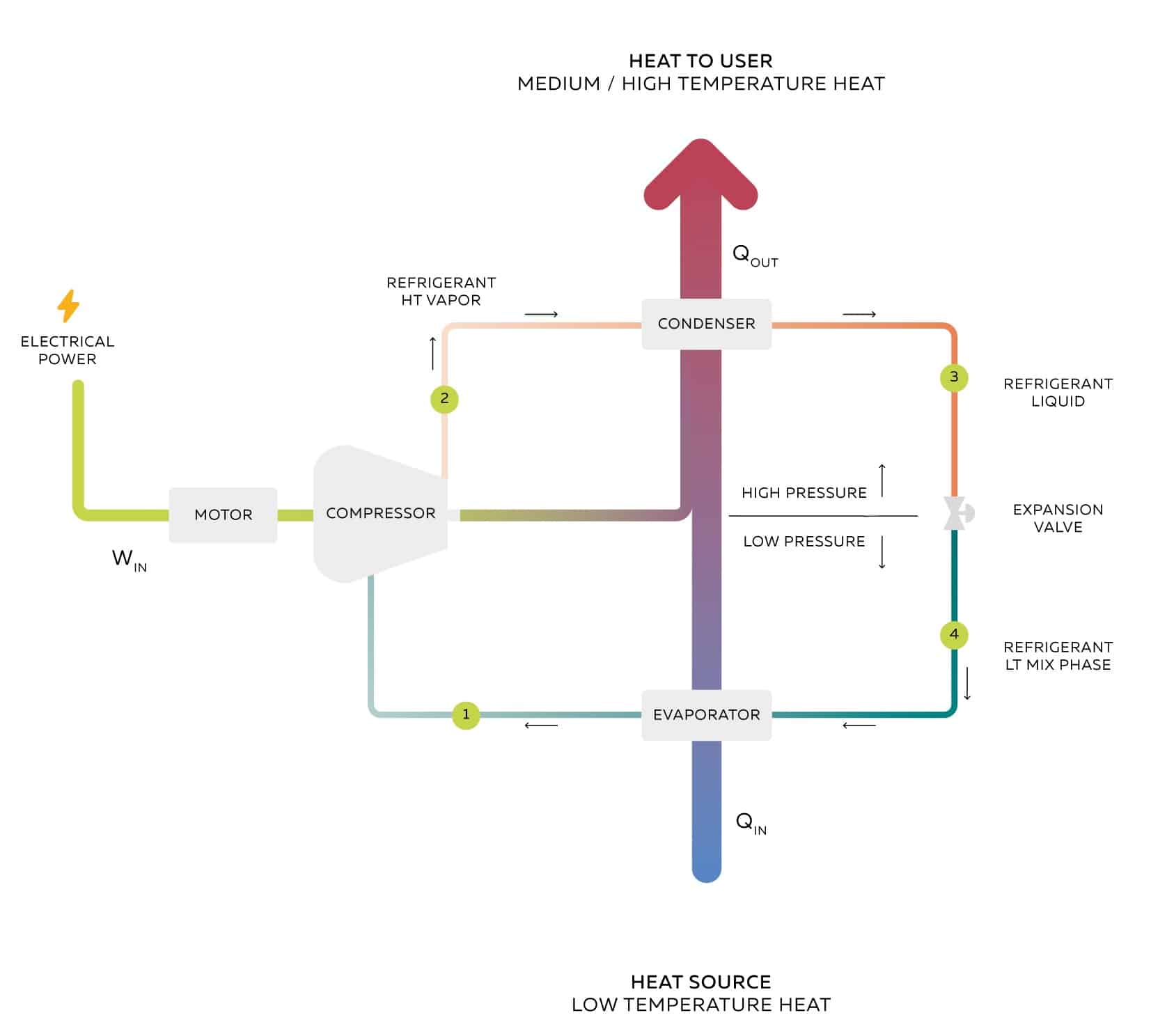 Al posto dei combustibili fossili, le pompe di calore utilizzano energia elettrica per trasferire calore da fonti a bassa temperatura ad altre applicazioni ad una temperatura piu elevata, assicurando un alto coefficiente di prestazione (COP) e una notevole riduzione delle emissioni di CO2.