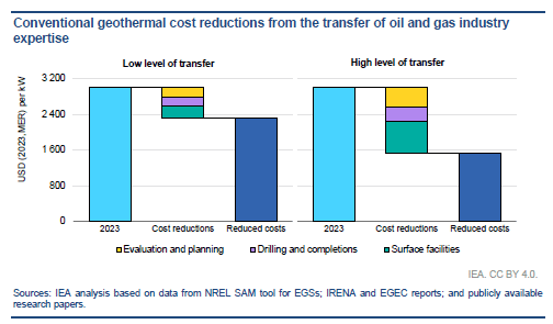 Leveraging this expertise could significantly reduce geothermal costs. For instance, the cost of providing district heating through conventional geothermal systems is nearly USD 3,000/kW, and Enhanced Geothermal Systems (EGS) costs have already dropped to about USD 15,000/kW in 2024, significantly lower than in recent years, largely due to the adoption of drilling and completion techniques honed in the oil and gas industry. In addition, applying a high number of practices from oil and gas operations could potentially reduce costs by nearly 15%. Scaling up surface practices through modular, repetitive design and improving drilling efficiencies by widely applying oil and gas technologies could provide a further 35% cost reduction. For EGSs, widespread knowledge transfer from the oil and gas industry, combined with additional research support to acquire and improve reservoir data, processing, and modelling during the evaluation and planning stages, could reduce costs by approximately 10%. In total, it is estimated that significant knowledge transfer and productivity gains from the oil and gas industry could lead to a reduction of up to 50% in the costs of conventional geothermal technologies, while next-generation technologies could experience a nearly 80% reduction in costs.